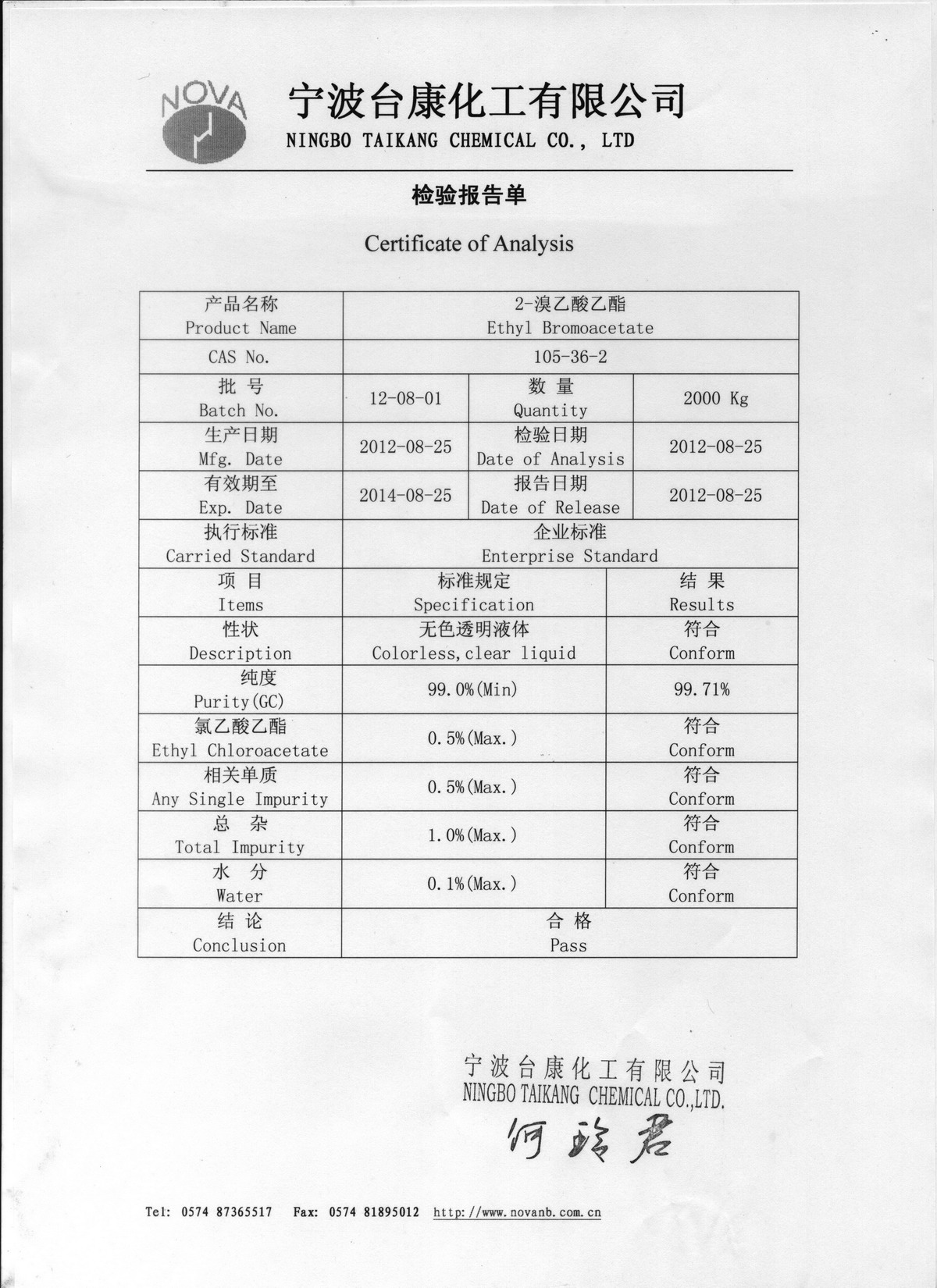 Ethyl bromoacetate--NINGBO TAIKANG CHEMICAL CO.,LTD--1-(2,3-Dichlorophenyl)-piperazine hydrochloride| 1-(3-Chlorophenyl)piperazine hydrochloride| 1-Phenylpiperazine hydrochloride| FMT CAS NO. 82294-70-0| PHE CAS NO.115065-79-7